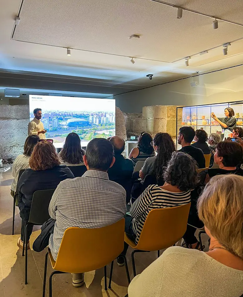 The talk addressed the main challenges involved in both the restoration of the Palacio Valeriola —to transform it into the current Hortensia Herrero Art Centre— and the construction of the Roig Arena along with the planning of its urban surroundings. On one hand, the design of the Hortensia Herrero Art Centre offered the opportunity to intervene in Valencia’s historical heritage and recover an architectural and artistic legacy spanning several centuries: from the remains of the Roman circus and traces of the medieval Jewish quarter to the seventeenth-century Baroque palace. On the other hand, the Roig Arena —designed in collaboration with the global architecture firm HOK— together with the other three nearby projects, was conceived to transform the Quatre Carreres district into a new international urban catalyst for Valencia. The multifunctional venue, covering 58,500 m², can accommodate up to 15,600 people in basketball mode and 20,000 in concert configuration on its central floor. Its ceramic louver façade, an unprecedented solution that defines its architectural identity, along with the outdoor terraces and its culinary offering, make it a new meeting point for the city.