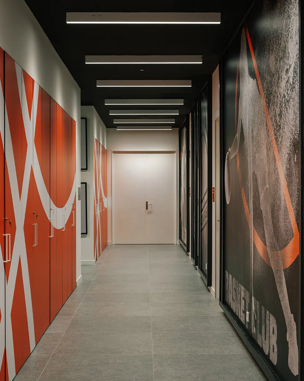 The circulation spaces, dominated by orange, black, and white tones, are conceived as settings that accompany visitors from the entrance to the most private areas, reinforcing a sense of exclusivity and belonging. Carefully integrated lighting highlights the geometry of the spaces, while mirrored surfaces enhance their depth. Large-format graphics draw the eye to the club’s history through the depiction of its most iconic players.
