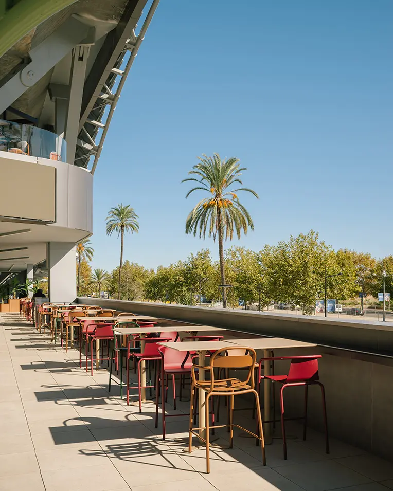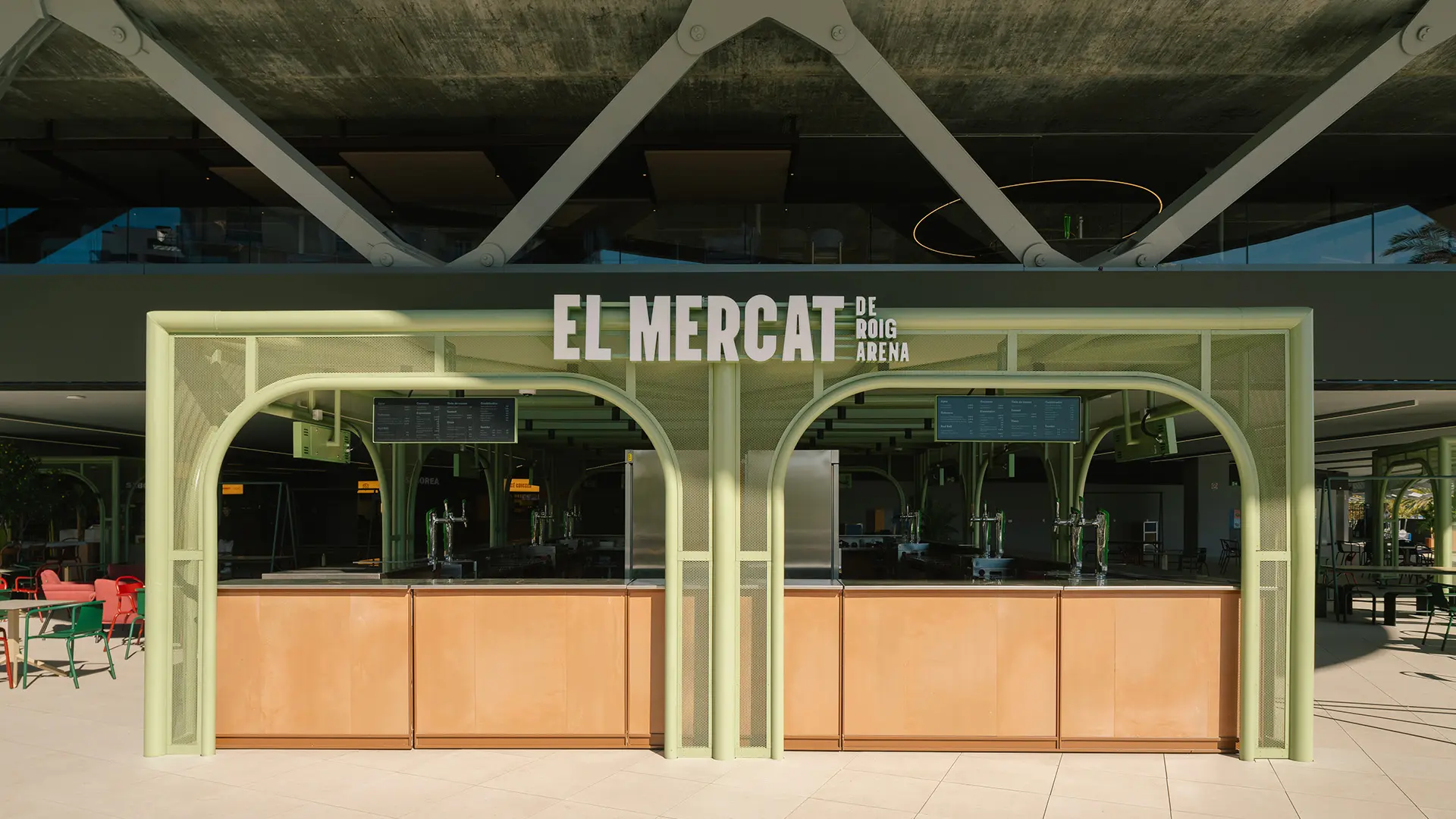 Frente a los puestos, se despliega una amplia terraza donde las pérgolas, tanto fijas como móviles, se convierten en protagonistas. Estas estructuras metálicas de color verde, diseñadas a medida, destacan por sus pequeñas perforaciones que realzan su ligereza visual. Además de proporcionar sombra y protección solar, las pérgolas organizan el espacio de manera eficiente, permitiendo una configuración flexible que se adapta fácilmente a diferentes eventos y públicos.
