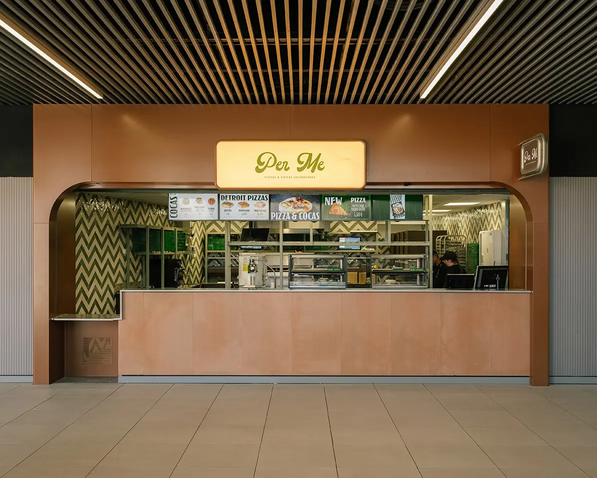 La elección de revestimientos metálicos en tonos tierra nace del deseo de añadir matices cromáticos que aporten calidez visual a fin de crear una atmósfera acogedora al aire libre. La iluminación, cuidadosamente integrada, resalta el producto, elevando la experiencia de consumo de los usuarios.