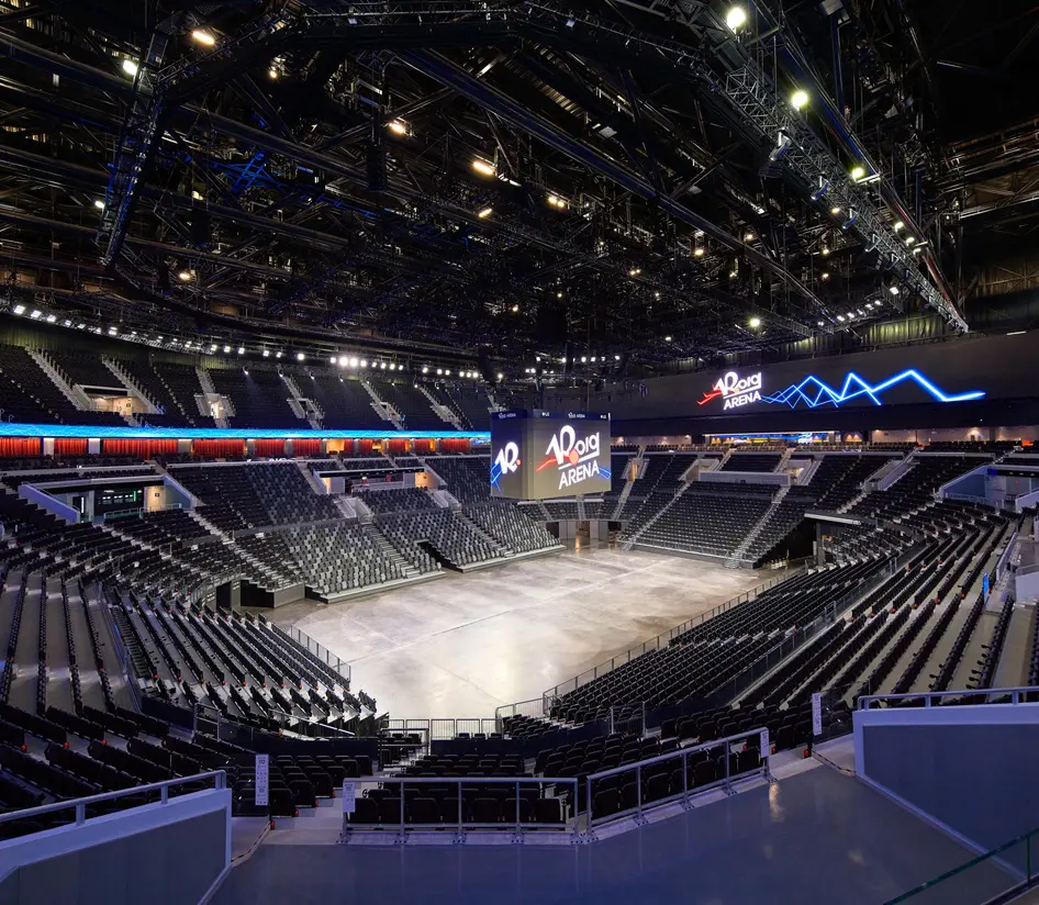 El control acústico ha sido una prioridad en este proyecto. El espacio de un metro de capas aislantes que estratégicamente se ha colocado entre el graderío interior y los muros exteriores ayuda a reducir la propagación del sonido hacia el exterior. Materiales fonoabsorbentes se integran en este diseño flexible para mantener el sonido dentro del edificio, garantizando un correcto aislamiento acústico. Además, el equipo ha trabajado con prestigiosos consultores de relieve internacional para el diseño de la acústica interior del arena, a fin de optimizar el sistema de sonido en base a la geometría espacial de la pista principal, minimizar las áreas de reflexión acústica, conseguir tiempos de reverberación óptimos.