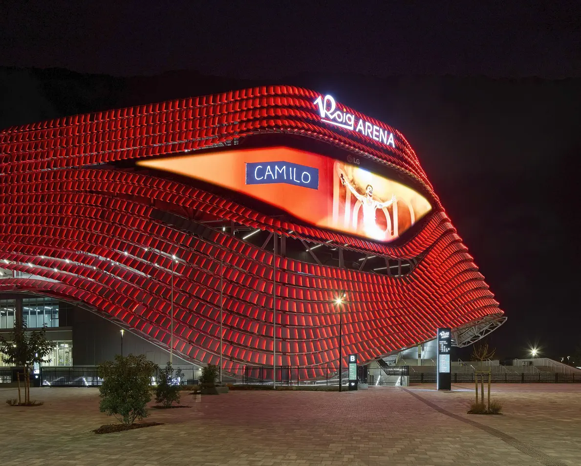 En el exterior, “El Ojo”, la gran pantalla LED de 48 x 10 metros preside la entrada principal en la fachada noroeste, caracterizada por su tecnología de alta durabilidad específicamente adaptada al clima mediterráneo.